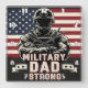 This powerful graphic features a proud military figure in tactical gear, standing with arms crossed against a distressed American flag. Below the soldier, the bold text "MILITARY DAD STRONG" is prominently displayed, flanked by star banners. This striking design is a patriotic tribute, celebrating the strength, service, and unwavering dedication of military fathers.