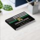 This graduation design features a military flag with black and white stripes, and a thin green line stripe as well. The gold army boots sits above the name of the graduating sergeant, captain, soldier, lieutenant or general.