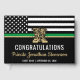 This graduation design features a military flag with black and white stripes, and a thin green line stripe as well. The gold army boots sits above the name of the graduating sergeant, captain, soldier, lieutenant or general.