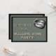 Welcome Home Soldier Party invitation that celebrates military pride and a happy homecoming. Add your soldier's name to the dog tags on front, and fill in the customised text on the back for your own personalised touch. Shown in Army green and black with dogtags on front and tank on back.
