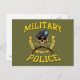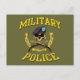 Skull wearing beret over crossed flintlock pistols. Scroll contains Military Police corps motto. Large text reads "Military Police". Crossed flintlocks and MP badge on reverse.