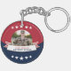 Honour your serviceman with this patriotic red white and blue two inch round acrylic double-sided key chain featuring a single centred circle photograph, a stars and stripes banner with a faux foil border and placeholders for your special service person's name and rank. Great gifts for parents and grandparents! Available in other types and sizes.