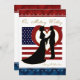 Customised patriotic American flag military wedding invitation, with heart and kissing silhouette bride and groom! Main colours are red white, blue, and golden. This invite template is ready for you to customise your wedding day details in the provided template areas. If you would like to change the font or the colours of fonts, placement of text or rearrange anything simply click on 'customise' and all these options will be available to you! Please visit our store for matching patriotic items such as reception placement cards, table number cards, response cards, postage stamps, military ornaments and wedding favours, and much more.