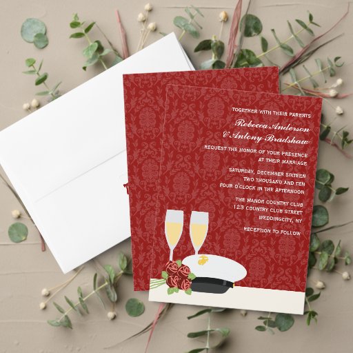 This fully customisable wedding invitation features a beautiful illustration of a military dress uniform and a wedding gown. Custom colours available by request.