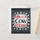 "Milk A Cow Today" is a cute text design in grey with black and red text. It sits on a white accent shape and cute white polka dots surrounding it.