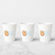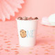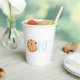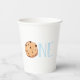 Milk and cookies first birthday paper cups with blue One and chocolate chip cookie.