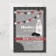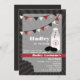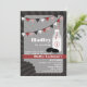 A birthday invitation featuring an illustration of a bottle of milk with red and white striped straw and two chocolate sandwich cookies. Invitation also features chevron and solid bunting and sunburst design. Background has "bite" at bottom left corner. Personalise the text.
