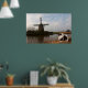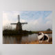 A handsome Keeshond posed in front of a windmill and canal in his native Holland.