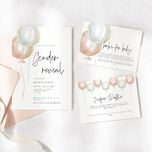 Unveil the Surprise: Elevate your gender reveal baby shower with Pink and Blue Balloon invites & decor collection. Adorned with whimsical script fonts and delicate gold flecks, the enchanting invitations, signage, and decor set the stage for a magical celebration. Let the joyous anticipation come to life as you gather your loved ones to share in the moment. #zazzlemade