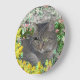 Blossoms of golden yellow, peach orange and creamy white surround this grey and brown tiger cat, both on the ground and falling from the heavens. Mimosa has mostly grey fur, with vibrant green eyes and perky ears. You may experience peace, serenity and healing as you look at my work.