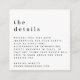 A charming miniature size 2.5" square to enclose with your invitations. The header is large and in stylish lowercase with the details beneath and lots of white space on a square shape for a contemporary style. Easily personalise the text to your own details.