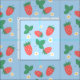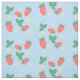 A fabric design that features a delightful and playful pattern of scattered mini strawberries on a soft, sky blue background. The strawberries are rendered in a vibrant red with green leaves, and they are interspersed with small, delicate white or light yellow flowers, adding to the charm. The overall impression is cheerful, fresh, and sweet, making it ideal for various children's items such as clothing, bedding, or nursery decor.