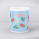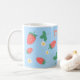 A sweet cute mug that features a delightful and playful pattern of scattered mini strawberries on a soft, sky blue background. The strawberries are rendered in a vibrant red with green leaves, and they are interspersed with small, delicate white or light yellow strawberry flowers, adding to the charm. The overall impression is cheerful, fresh, and sweet, making it ideal for children.