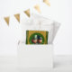 Miniature Leprechaun in 3D + "Happy St Patrick's Day" into a green circle + golden textured paper (image printed) as background. Design on favour bag.