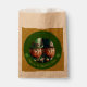 Miniature Leprechaun in 3D + "Happy St Patrick's Day" into a green circle + golden textured paper (image printed) as background. Design on favour bag.
