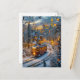 A charming miniature tram glides through a snow-covered city at night, inspired by winter scenes in Helsinki, Finland.