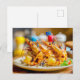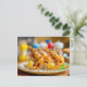 miniature workers preparing grilled shrimps holiday postcard