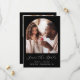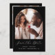 This simple, minimalist Save the Date card features a boho photo arch above the words "Save the Date" in elegant white handwriting script, followed by the couple's names, wedding date and city in sans serif font on a black background. Add a second, horizontal photo and a more detailed message with additional information on the reverse.