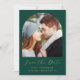 This simple, minimalist Save the Date card features a boho photo arch above the words "Save the Date" in elegant gold-coloured handwriting script, followed by the couple's names, wedding date and city in sans serif font on an emerald green background. Add a second, horizontal photo and a more detailed message with additional information on the reverse.