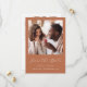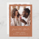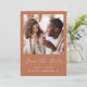 This simple, minimalist Save the Date card features a square photo above the words "Save the Date" in elegant white handwriting script, followed by the couple's names, wedding date and city in sans serif font on a terracotta background. Add a second, horizontal photo and a more detailed message with additional information on the reverse.