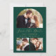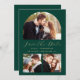 This simple, minimalist Save the Date card features a custom photo arch above the words "Save the Date" in elegant gold-coloured handwriting script, followed by the couple's names, wedding date and city in sans serif font on an emerald green background. Two smaller, square photos appear at the bottom of the card. Add a more detailed message with additional information on the back.