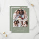 This simple, minimalist Save the Date card features a 3-photo collage arch above the words "Save the Date" in elegant white handwriting script, followed by the couple's names, wedding date and city in sans serif font on a sage green background. Add a fourth, horizontal photo and a more detailed message on the back.