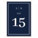 These elegant, modern wedding table numbers feature a simple dark navy blue minimalist text design, with a classic white frame at the border. Add your initials or monogram to make them completely your own.
