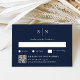These elegant, modern dark navy blue wedding RSVP response cards feature a simple white text design that exudes minimalist style. Add your initials or monogram to make them completely your own. This wedding response card serves as both a combo traditional rsvp your guest can return, as well as a QR code for those who prefer to rsvp online instead.