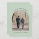 Minimal sage green save the date announcement card featuring your photo in an arched picture frame and simple modern typography.