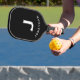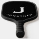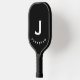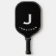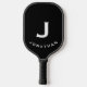 Masculine modern design features black background with easy to use template for a single letter and name in stylish classic professional leterring. The design repeats on the reverse side. Perfect pickleball gift for him.