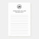 A professional lined notepad with a minimalist monogrammed design in a black and white colour palette. Custom name and title, role or custom text presented on a simple white background. Personalise using the fields provided or use the 'message' button to contact the designer for help.