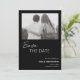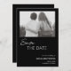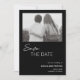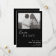 Modern black wedding save the date card featuring a simple and minimal design with the header in an elegant script and a contemporary sans serif font. Above is your favourite photo and below in the lower right corner are your event details in a minimalist layout. The back has an optional QR Code and additional details. If you prefer, you may remove the QR Code in the design editing tool.