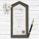 AVAILABLE WITH OR WITHOUT A QR CODE OR DINNER SELECTION OPTIONS. This design features a charcoal black background with a white text area framed in faux gold foil. A monogram with the bride and groom's first initial on the outside flap completes it. Created by Simply Farmhouse Press.