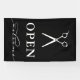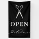 Vertical Open business banner for a hair salon or seamstress with a pair of scissors in white over OPEN written in elegant letters, and welcome in a swirly script against a black background. A clean, minimalist open for business banner for a hair salon, barbershop, or similar. Black small business open banner without logo with a pair of scissors.
