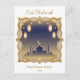 Minimal Blue & Gold Mosque Skyline Eid Mubarak Postcard