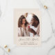 This simple, minimalist Save the Date card features a boho photo arch above the words "Save the Date" in elegant black handwriting script, followed by the couple's names, wedding date and city in sans serif font on a beige background. Add a more detailed message with additional information on the reverse.