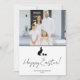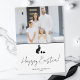 Destei's minimal and stylish Easter card template featuring a bunny silhouette and two Easter eggs in black color. The top half is a photo template for a custom family photo and the bottom displays a “Happy Easter!” message with space for a family name and year. Perfect for creating a modern, personalized Easter greeting.