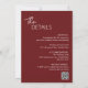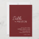 Modern burgundy all in one wedding invitation featuring a simple and minimal design with the bride's name in an elegant script and the groom's name in a contemporary sans serif font. Below in the lower right corner are your event details in a minimalist layout. The back has your additional details and QR Code, so you can skip the enclosure card and RSVP card.