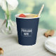 Minimal business logo simple typography soft white and navy blue branded coffee paper cups. Customise with your company's logo and add your own personalised text. Text font and colour can easily be changed in the design editor to match your branding colours.