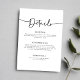 Elegant and refined, Minimal Calligraphy Wedding Details Enclosure Card offers the fusion of elegant design and modern aesthetics. This minimalist masterpiece effortlessly combines simplicity with a touch of luxurious detail, perfect for the contemporary couple seeking a high-end touch. The script typography is strikingly displayed against a classic white background, providing an immediate visual appeal that's both chic and sophisticated. With an emphasis on minimal elements, the card presents wedding details and wedding accommodation information in a clear and accessible manner, ensuring no detail is overlooked. Perfect for a minimal wedding, formal wedding, fall wedding, summer wedding, spring wedding, winter wedding, or just any modern wedding. Customise the background colour, text size, font styles, colours, and placement to your liking using the design tool. For matching items, visit the Minimalist Elegant Script Wedding invitations collection.