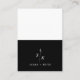 Flip the card to reveal a stunning black and white backdrop. The upper half remains crisp white, while the lower half transitions to a sleek black. A smaller scale version of the leaf monogram graces the black space, accompanied by the bride and groom's names in a complementary font.