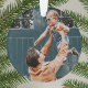 Simple, stylish, minimalist christmas ornament with a modern minimalist typographic quote "merry & bright" in black on a olive green background. The name, year and greeting can be easily customised for a personal touch, perfect for the festive season! The image shown is for illustration purposes only to be replaced with your own photo. The placeholder image is of a dad wearing a corduroy shirt, holiding his cute toddler in the air! The little by is wearing denim dungarees and cool shades. The backdrop is of a double glazed door painted in a rich teal colour! #christmas #merryandbright #minimal