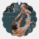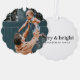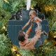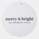 Simple, stylish, minimalist christmas ornament with a modern minimalist typographic quote "merry & bright" in black on a clean minimal white background. The name, year and greeting can be easily customised for a personal touch, perfect for the festive season! The image shown is for illustration purposes only to be replaced with your own photo. The placeholder image is of a dad wearing a corduroy shirt, holiding his cute toddler in the air! The little by is wearing denim dungarees and cool shades. The backdrop is of a double glazed door painted in a rich teal colour! #christmas #merryandbright #minimal