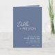 Modern dusty blue folded wedding invitation featuring a simple and minimal design with the bride's name in an elegant script and the groom's name in a contemporary sans serif font. Below in the lower right corner are your event details in a minimalist layout. The inside has your favourite photo and your additional details, including an optional QR code (if you prefer, the QR code may be removed in the design editing tool). The back has two more optional sections for more information.