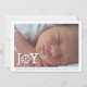 Modern minimal "joy" and snowflake Christmas holiday flat photo card. It showcases a baby photo and the word “JOY” in white with a snowflake instead of the letter O and a white border around it. On the back there is a pattern of white snowflakes on dusty blue background.