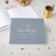 This minimal leaf blue and white monogram back wedding guest book is perfect for an elegant wedding. The design features a simple greenery silhouette in white on a dusty blue background with classic minimalist style. Personalise the front cover with the names of the couple and the wedding date.
