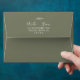 This minimal leaf dark green wedding invitation envelope is perfect for a boho wedding. The design features a simple greenery leaf silhouette in olive green with minimalist mountain bohemian style. Personalise the envelope flap with your return address. These envelopes can also be used for a bridal shower, rehearsal dinner, or any special event.