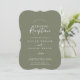 This minimal leaf dark green wedding reception invitation is perfect for a boho post elopement party. The design features a simple greenery leaf silhouette in olive green with minimalist mountain bohemian style. RSVP cards are sold separately, or you can add RSVP info to the back of the card.