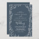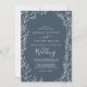 This minimal leaf slate blue wedding invitation card is perfect for an elegant wedding. The design features a simple greenery silhouette in a dark grey blue with classic minimalist style.