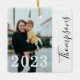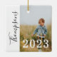 Minimal and modern non-traditional Christmas ornament featuring a simple and modern design with a family photo and trendy family name script. Bold year photo overlay. The reverse side features a second photo.